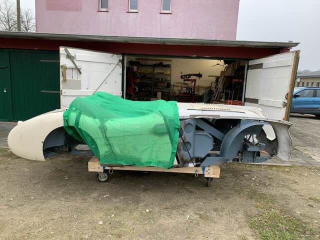 Wir haben einen neuen Betrieb René Große für die Karosseriearbeiten gefunden. Der Betrieb ist zwar etwas weiter weg, aber immer noch nah genug, um auch kurzfristig mal vorbeizuschauen. Wir haben das Chassis schon dort hingebracht, das ging dank des Gestells auch sehr gut.