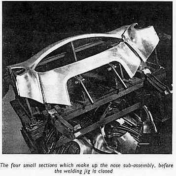 Die Leichtmetallstruktur der gesamten Karosserie besteht aus zwei großen, einteiligen Abschnitten, die jeweils die gesamte obere Fläche vor und hinter dem Cockpit bilden. Um den Zusammenbau und die Werkzeugherstellung zu vereinfachen, wird jedes Hauptpaneel durch das Zusammenschweißen einer Reihe kleinerer Abschnitte aufgebaut. Die Gesamtansicht der Schweißerei zeigt die Aufteilung der Unterbaugruppen deutlich. Im Vordergrund ist die aus vier kleinen, einfachen Teilen bestehende Bugschürze auf einer Vorrichtung montiert. Links steht ein komplettes, aus sieben Einzelteilen zusammengesetztes Heckteil bereit, um aus seiner Vorrichtung genommen zu werden. Rechts wird das Bugteil mit der Motorhaube verschweißt, die ihrerseits aus drei Teilen zusammengesetzt ist.