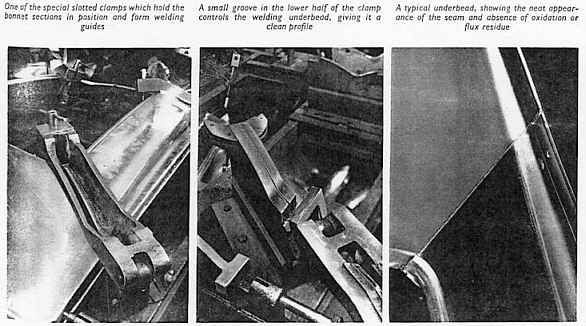 Die Vorrichtung für den Zusammenbau der Nase mit den einzelnen Platten ist abgebildet. In geöffneter Stellung sind die speziell geformten Klemmen zu sehen, die als Schweißführungen dienen. Wenn sie geschlossen sind, positionieren sie die Platten automatisch so, dass ein maximaler Schweißspalt von 1/16 Zoll bleibt. Eine dieser Klammern in geöffneter Stellung ist im Detail zu sehen, diesmal als Teil der Vorrichtung für die Montage der Motorhaube. Die obere Hälfte der Klammer ist entlang der Mittellinie geschlitzt, so dass die Oberseite der Platten auf jeder Seite der Verbindungslinie über eine Breite von etwa ¼ Zoll zugänglich ist. Die Seiten des Schlitzes sind abgeschrägt, um den Zugang für den Schweißbrenner zu erleichtern. Die Eindringtiefe wird durch eine halbkreisförmige Nut in der unteren, festen Hälfte der Klemme kontrolliert. Diese sorgt für eine Netto-Unterwulst, die etwa 3/16 Zoll breit und 1/8 Zoll tief ist. Da das gesamte überstehende Metall auf der äußeren, sichtbaren Oberfläche der Platte weggeschliffen wird, um eine glatte Oberfläche zu erhalten, bildet die Untersicke eine Verstärkung der Verbindung. Das saubere Aussehen der Unterseite ist in der Ansicht der Rückseite einer Verbindung in der oberen Haubenplatte gut zu erkennen. Nach dem Schweißen ist keine weitere Behandlung erforderlich.