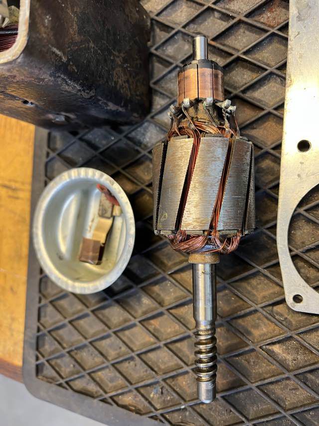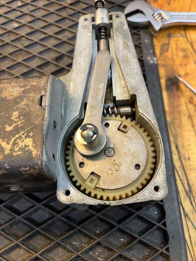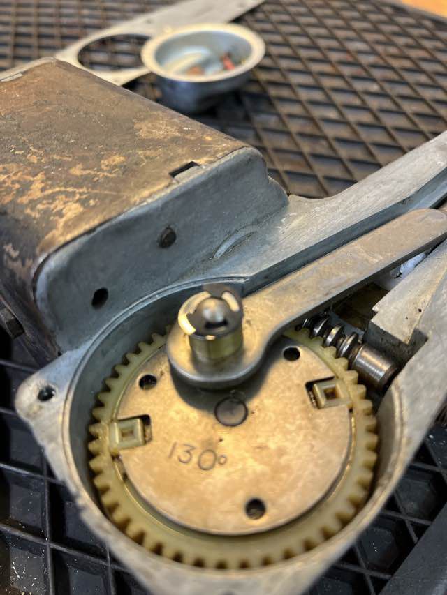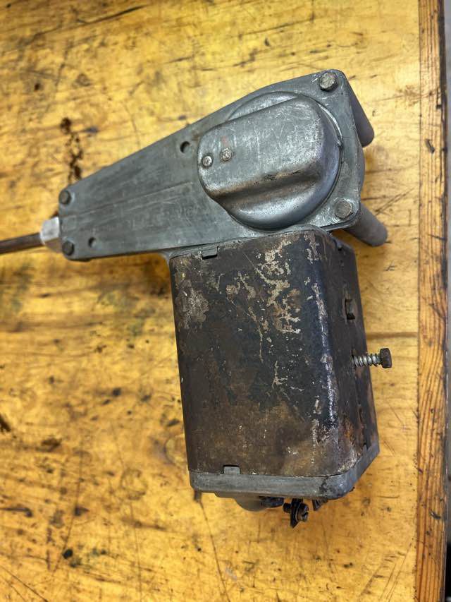 Im Austin Healey wurde ein Lucas DR2 Motor (Single Speed) verbaut. Das Kabel von dem Endabschalter wurde durchgetrennt, warum kann ich nicht sagen. Ansonsten machen der Motor und auch der restliche Antrieb einen guten Eindruck. Wir werden diesen jetzt säubern, neu fetten. Das Kabel wird wieder erneuert, die Kohlen sehen noch gut aus.