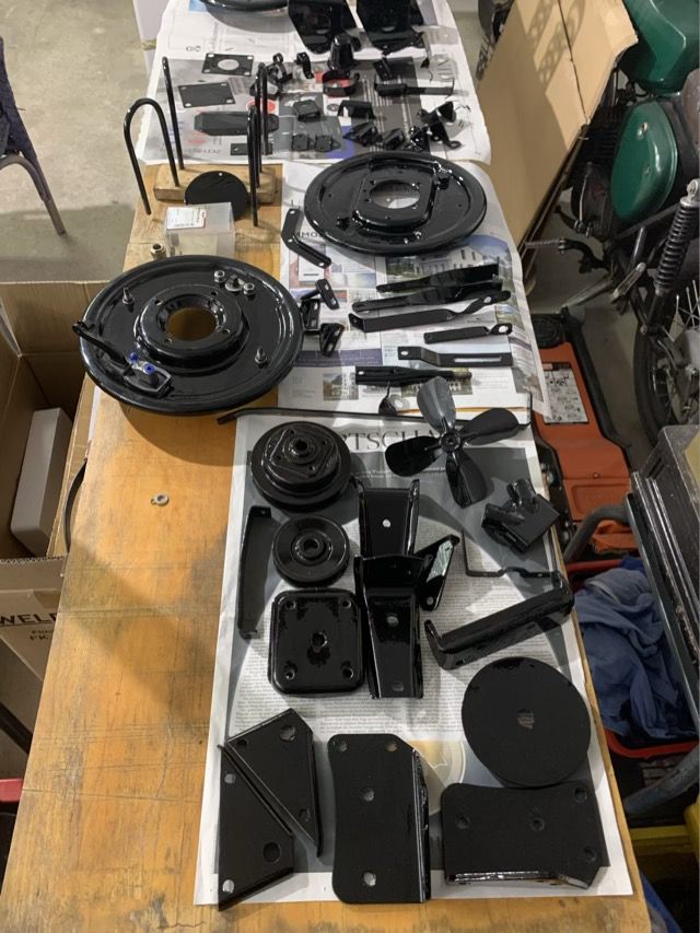 Die Fahrwerkskomponenten sowie weitere Teile für die Motoraufhängung und Kleinteile wurden überholt und mit einem Chassislack lackiert. Größere Teile wurden gesandstrahlt.