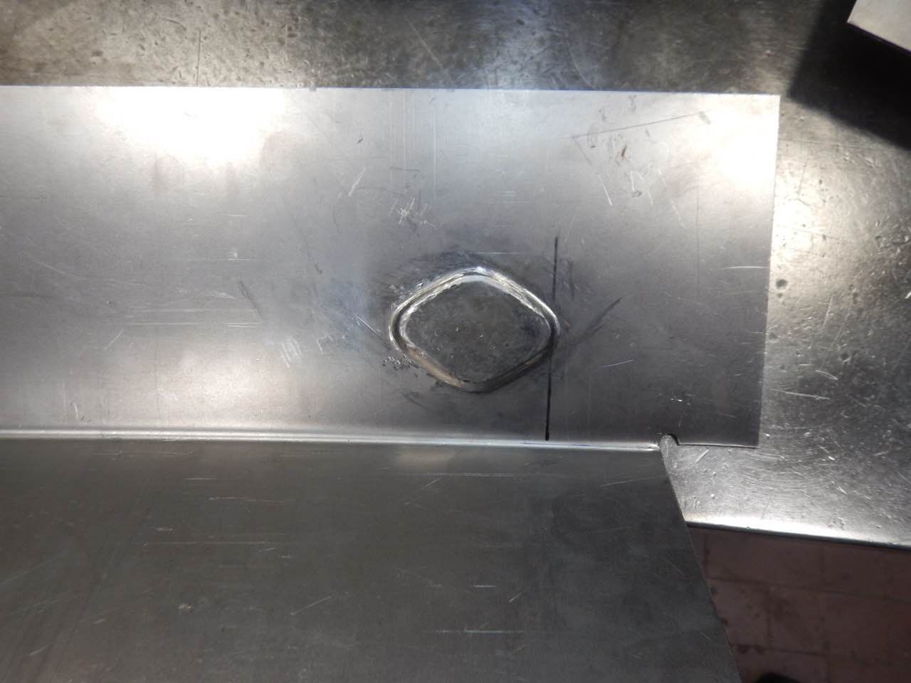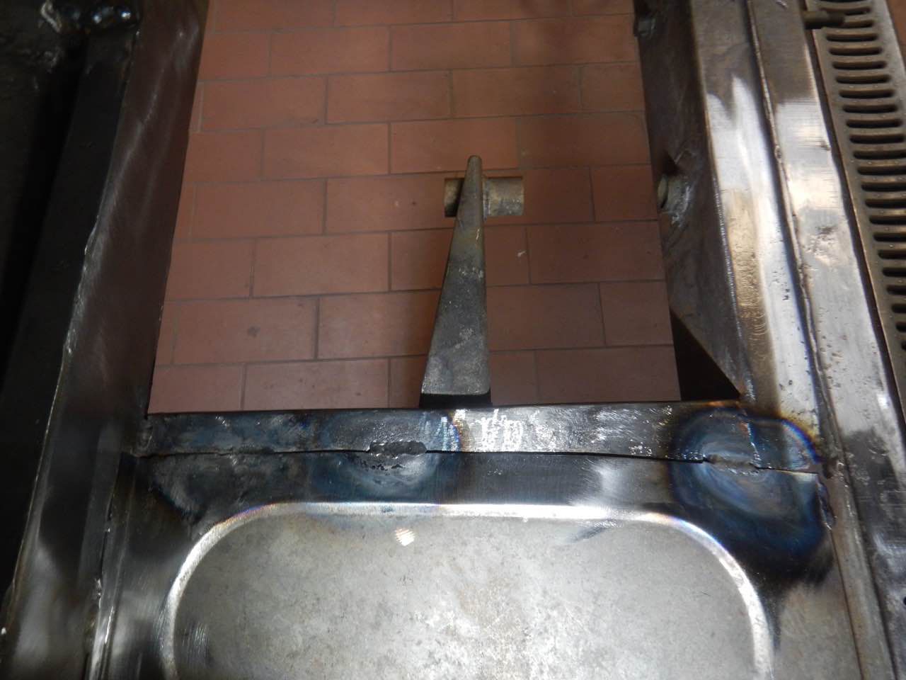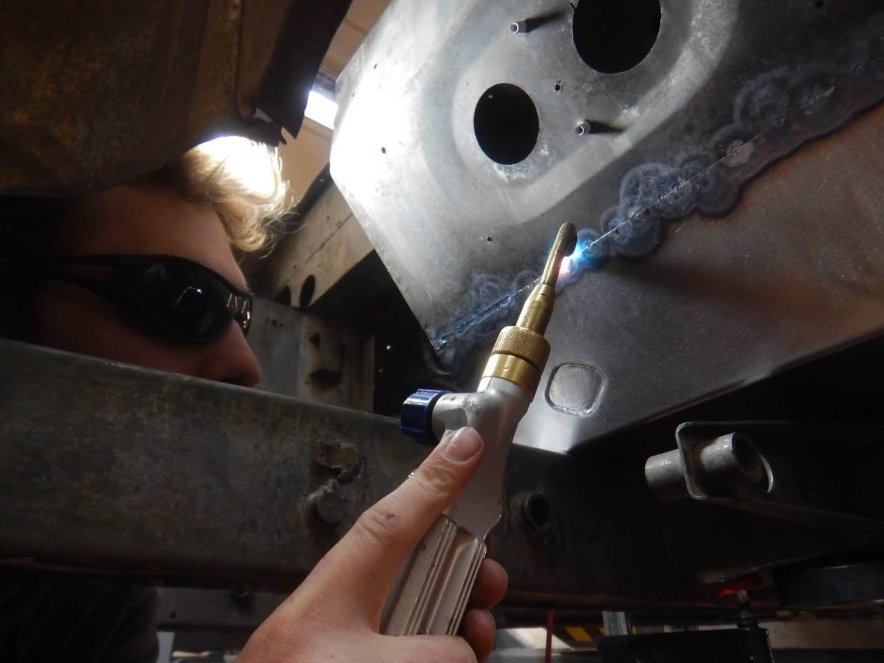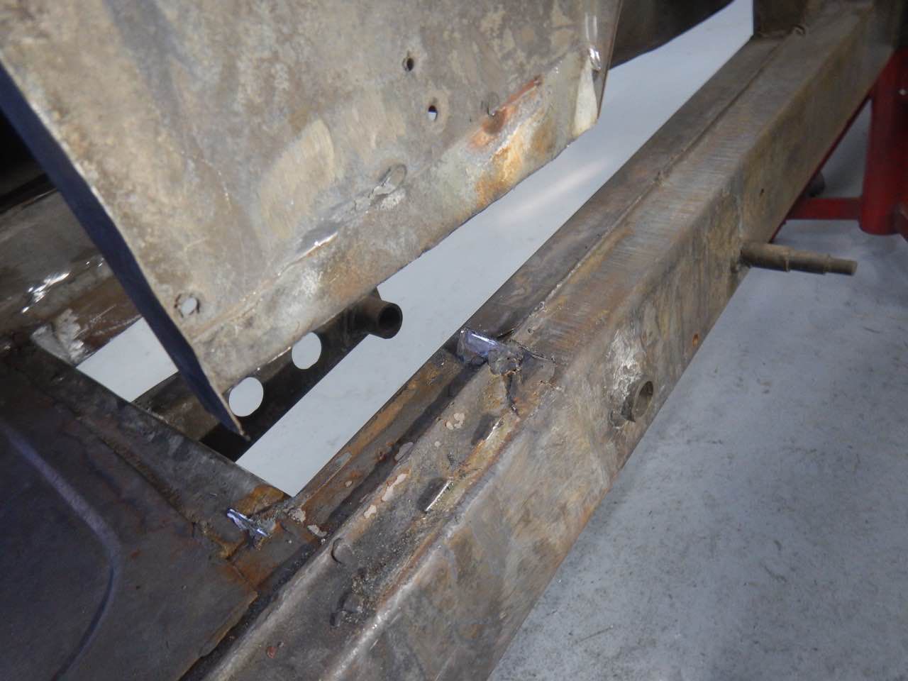 Der Fussraum auf der Fahrerseite musste überarbeitet werden. Eins der Blecher, auf den Abbildungen ist das ganz gut zu erkennen, musste ersetzt werden. Das Blech wurde nit den entsprechenden Sicken angefertigt und eingeschweißt. Es wurden ebenfalls die seitlichen Anschlussbleche überarbeitet.