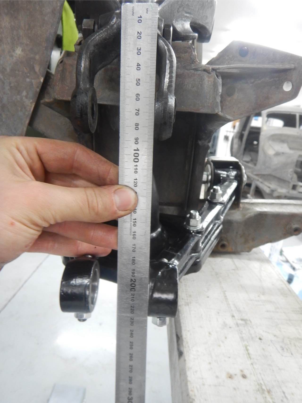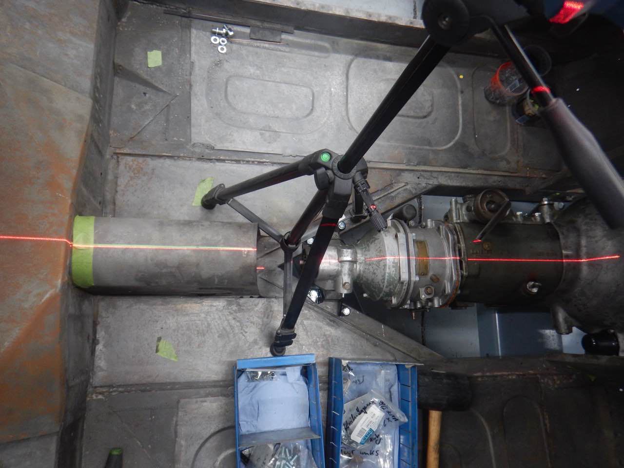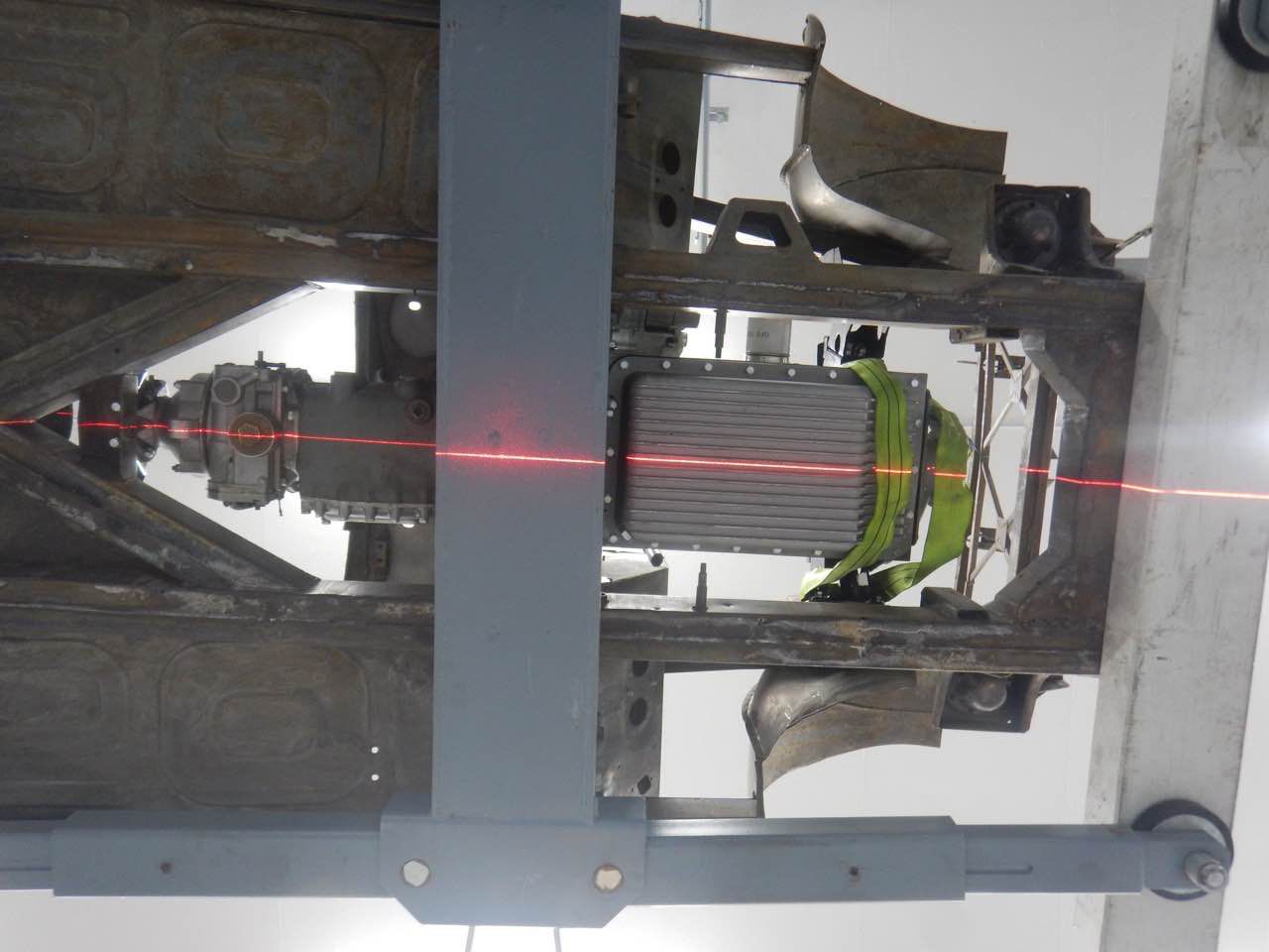Damit sichergestellt werden kann ob der Motor zentrisch im Chassis ausgerichtet ist, haben wir den Motor samt Getriebe zu dem Karosserieschlosser gebracht. Nur so kann festgestellt werden ob die Motorbefestigungen korrekt sind.
