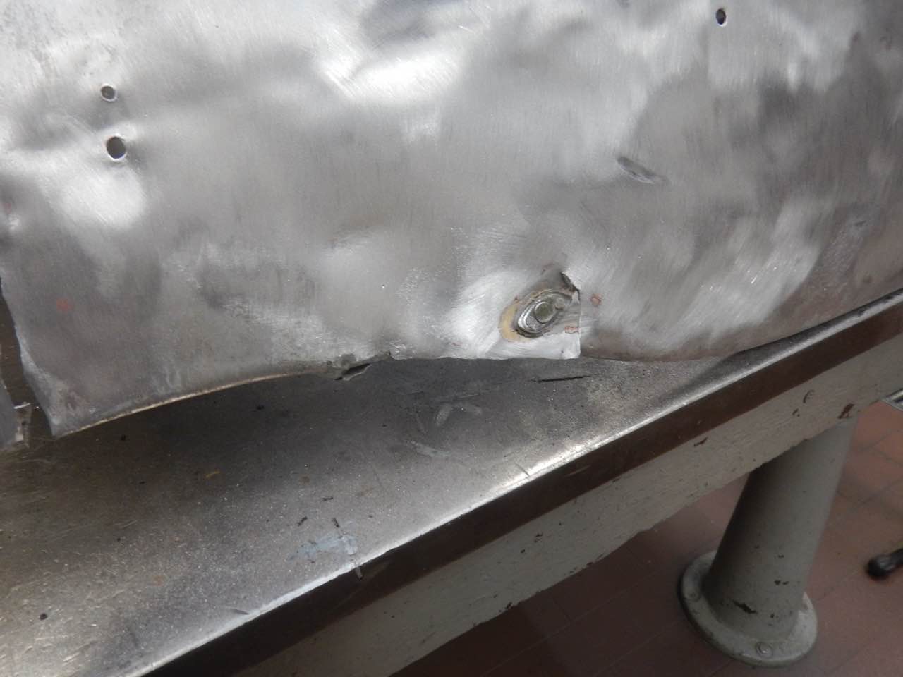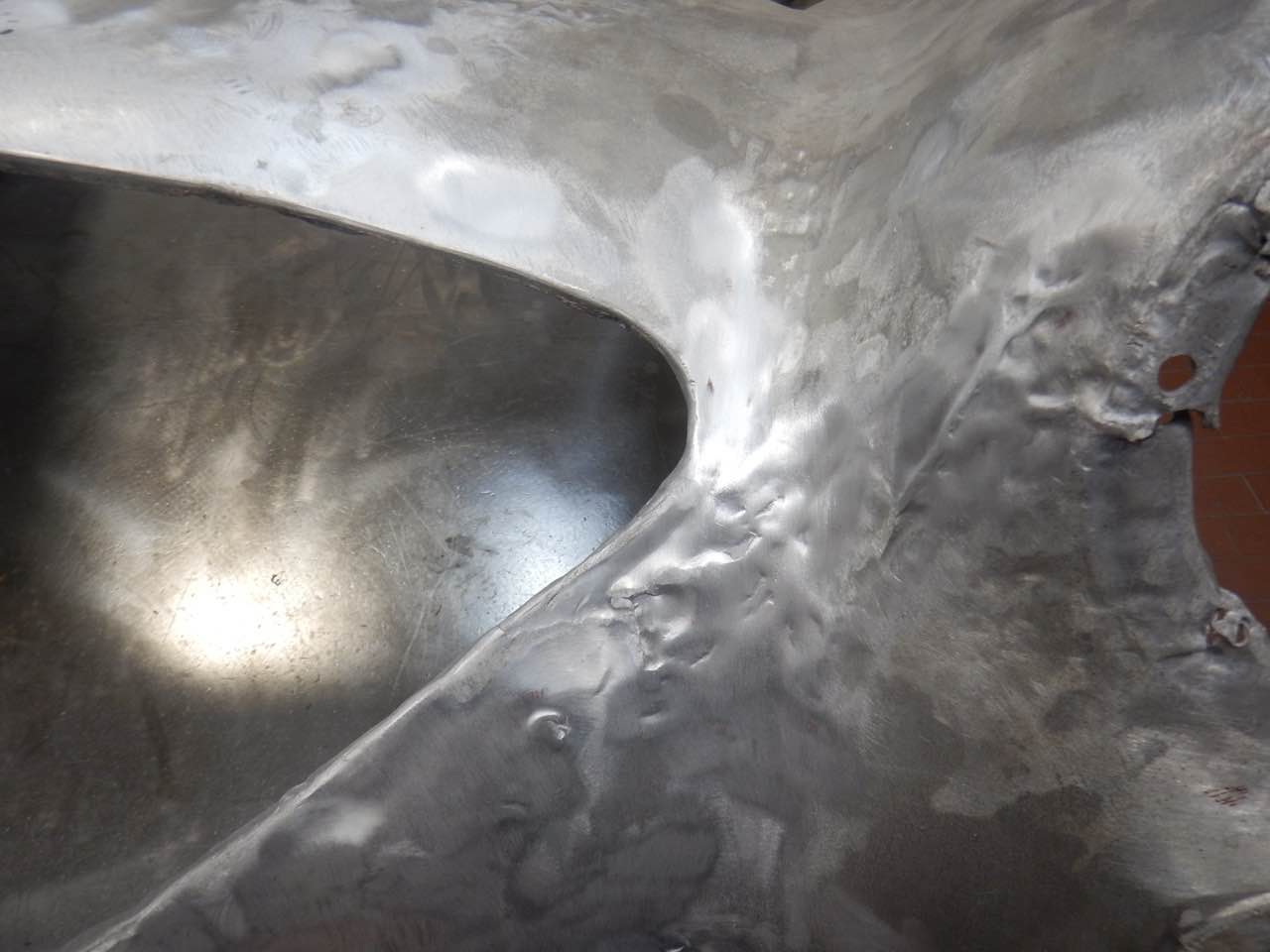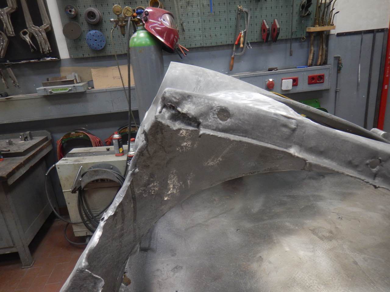 Das Frontshroud ist in keinem guten Zustand. Auf der Fahrerseite ist es im Bereich der Lampentöpfe stark beschädigt. Es wurde jedemenge Spachtel verwendet. Wir haben uns mit dem Restaurierungsbetrieb darauf verständigt nur für die Nase gegen ein Neuteil zu verwenden. Das Neuteil wird in das bestehende Teil eingearbeitet. Damit soll sich der Aufwand verringern.