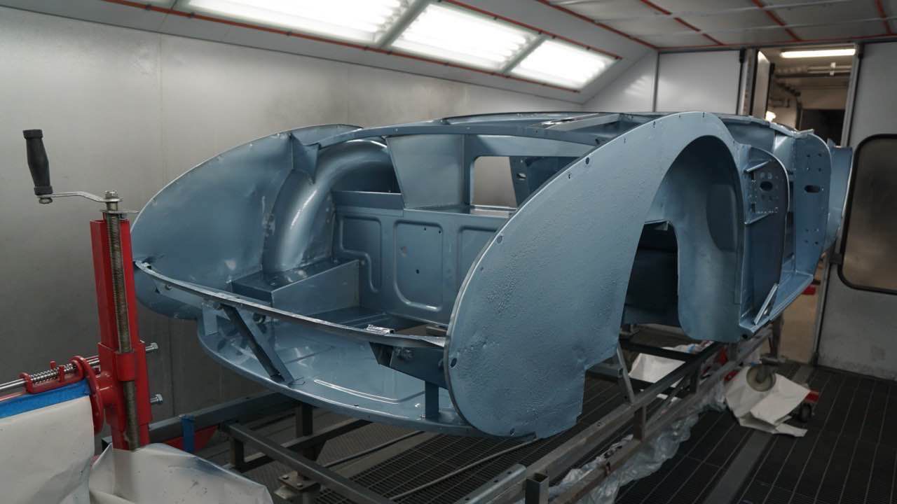 Nachdem die letzten Karosseriearbeiten abgeschlossen wurden, ist das Chassis grundiert und lackiert worden. Wir haben uns entschlossen den Austin in Ice Blue zu lackieren. Dazu haben wir einen Farbton gefunden der unsere Vorstellung von Ice Blue am nächsten kommt.