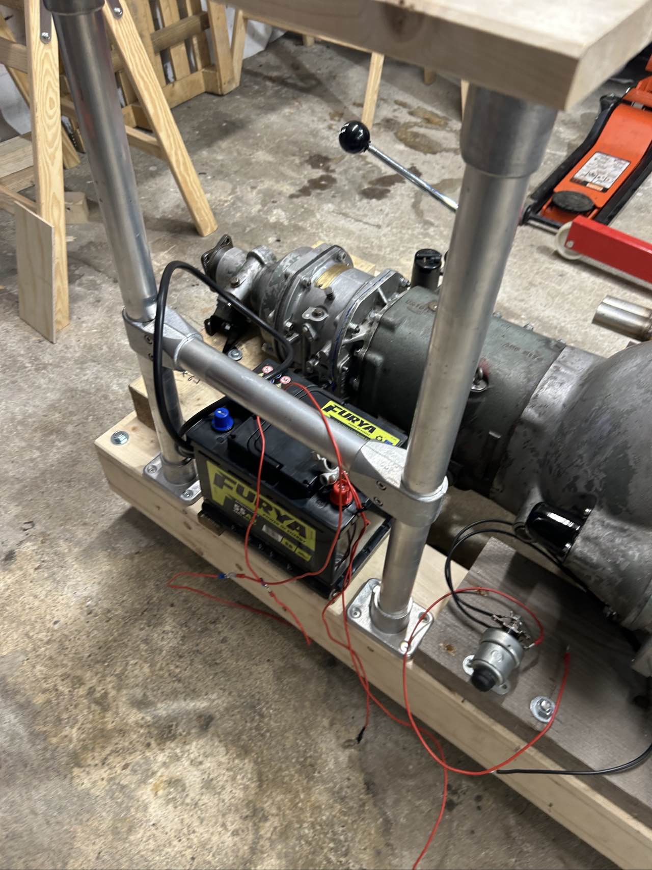 Dazu haben wir ein Basisgestell aufgebaut auf dem dann anschließend die notwendigen Komponenten befestigt wurden. Für die Steuerung wurde ein "Bedienpanel" gebaut, hier wurden der Drehzahlmesser sowie das Öldruck/Wassertemperatur Instrument eingebaut.