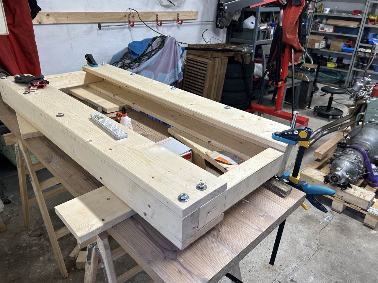 Damit der Motor mit seinen Komponenten unabhängig von dem Chassis vorab getestet werden kann, haben wir uns entschlossen ein Testgestell zu bauen. Damit der Aufwand sich in Grenzen hält haben wir uns Entschlossen, den Teststand aus Konstruktionsholz zu bauen.