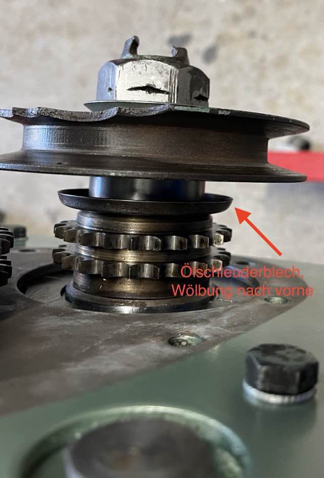 Nachdem die Mutter und die Unterlegscheibe entfernt wurden, kann die Riemenscheibe von der Welle abgezogen werden. Die Riemenscheibe ist verkeilt, hat aber keinen Kegelsitz, sodass das Herausziehen keine Schwierigkeiten bereitet, aber ein Abzieher kann vorteilhaft eingesetzt werden.