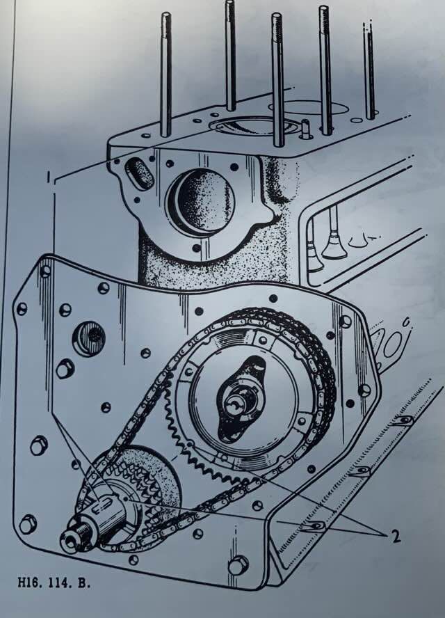 Der Steuergehäusedeckel und die Papierunterlegscheibe können nun entfernt werden, und gleichzeitig sollte der Ölwerfer (siehe 23, Abb. 30) von der Vorderseite der Kurbelwelle abgenommen werden. Achten Sie auf die korrekte Montage, um zu verhindern, dass Öl in die Lüfterradscheibe gelangt; Die konkave oder hohle Seite muss nach vorne zur Scheibe zeigen.