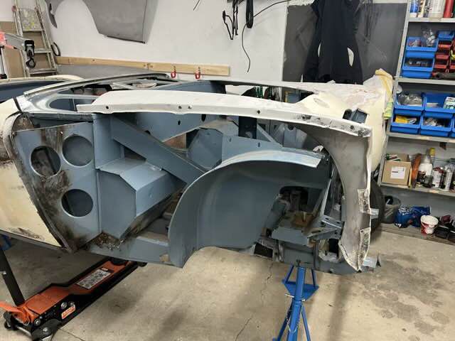 Aufgrund von verschiedenen Schwierigkeiten mit dem Karosseriebetrieb haben wir uns entschlossen, einen Schnitt zu machen. Wir haben jetzt so viele Jahre mit der Fertigstellung gewartet, der Wagen soll auch dementsprechend gut werden. Wir haben das Chassis abgeholt und vorerst in unserer Garage geparkt.