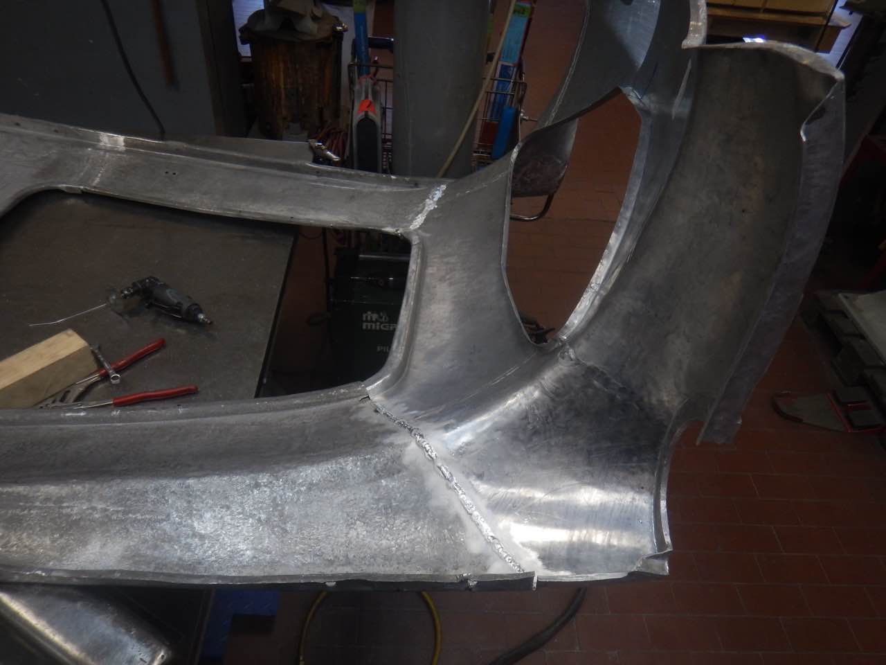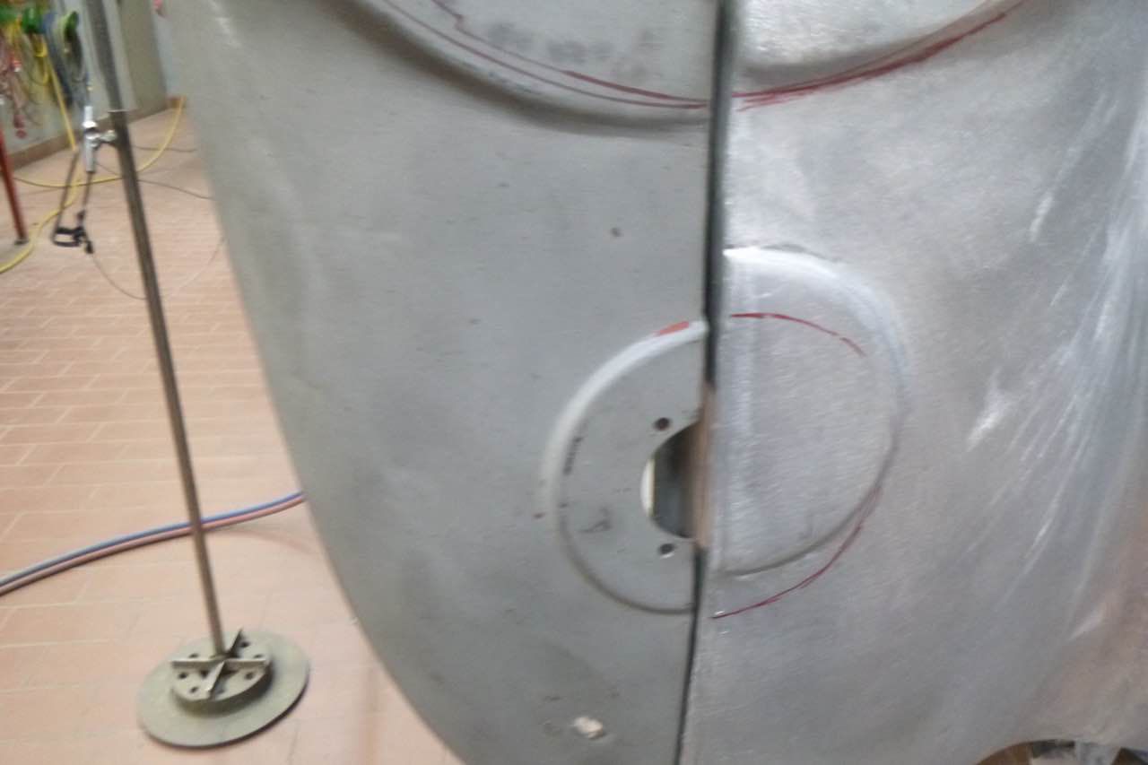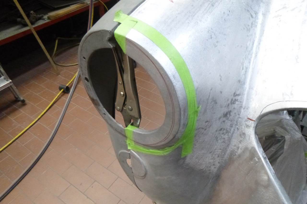Die Berabeitung kann immer nur, das ist eine Austin Healey Besonderheit, im zusammengebauten Zustand, also beide Kotflügel, zu beurteilen. Das erschwert die Arbeiten zusätzlich. Dazu kommt auch, dass die Lampen zur Hälfte im Shroud und Kotflügel sitzen, d.h. die Ausschnitte müssen zusammen passen ansonsten sitzen die Scheinwerfer später nicht richtig.