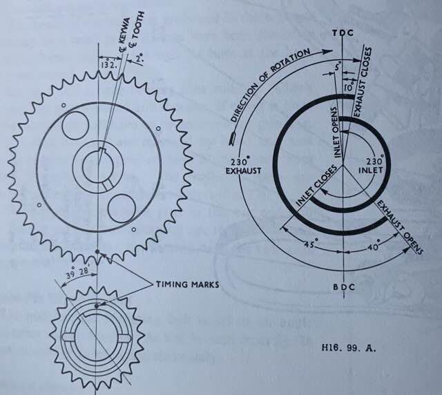 Die Steuerräder sind mit Markierungen versehen, und die Zeiteinstellung ist korrekt, wenn sich die Markierungen auf dem Kurbelwellenrad in ihrer engsten Position befinden. Um die Ventilsteuerung zu überprüfen, muss das Einlassventil 5 Grad vor dem oberen Totpunkt geöffnet werden, was auf dem Schwungrad einem Punkt von 9/16 Zoll vor dem oberen Totpunkt bei einem Durchmesser von 12 13/16 Zoll entspricht, wobei die Stößel auf 0,021 Zoll vor der Steuerung eingestellt werden. Diese sollten anschließend auf 0,012 Zoll eingestellt werden, um einen normalen Betrieb zu gewährleisten.