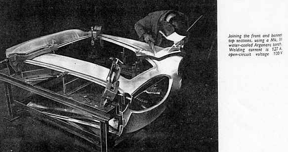 Die Leichtmetallstruktur der gesamten Karosserie besteht aus zwei großen, einteiligen Abschnitten, die jeweils die gesamte obere Fläche vor und hinter dem Cockpit bilden. Um den Zusammenbau und die Werkzeugherstellung zu vereinfachen, wird jedes Hauptpaneel durch das Zusammenschweißen einer Reihe kleinerer Abschnitte aufgebaut. Die Gesamtansicht der Schweißerei zeigt die Aufteilung der Unterbaugruppen deutlich. Im Vordergrund ist die aus vier kleinen, einfachen Teilen bestehende Bugschürze auf einer Vorrichtung montiert. Links steht ein komplettes, aus sieben Einzelteilen zusammengesetztes Heckteil bereit, um aus seiner Vorrichtung genommen zu werden. Rechts wird das Bugteil mit der Motorhaube verschweißt, die ihrerseits aus drei Teilen zusammengesetzt ist.