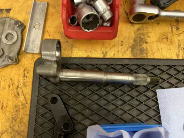 Das Lenkgetriebe wurde zerlegt, beide Lager wurden erneuert. Zudem hatte sich gezeigt, dass der Lenkungsfinger verschließen war. Ich habe das festgestellt, wenn im zusammengebauten Zustand die Lenkung betätigt wurde, lief diese nicht flüssig, sondern „ruckelte“. Nachdem ich den Lenkunsfinger dann ausgebaut hatte, konnte ich starke Abnutzungen im Lager erkennen.