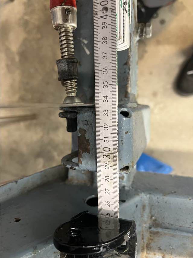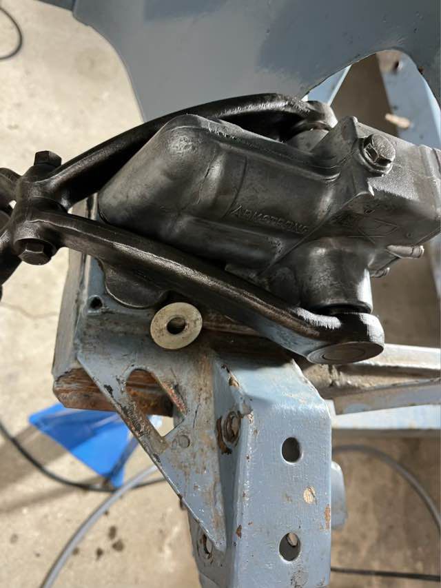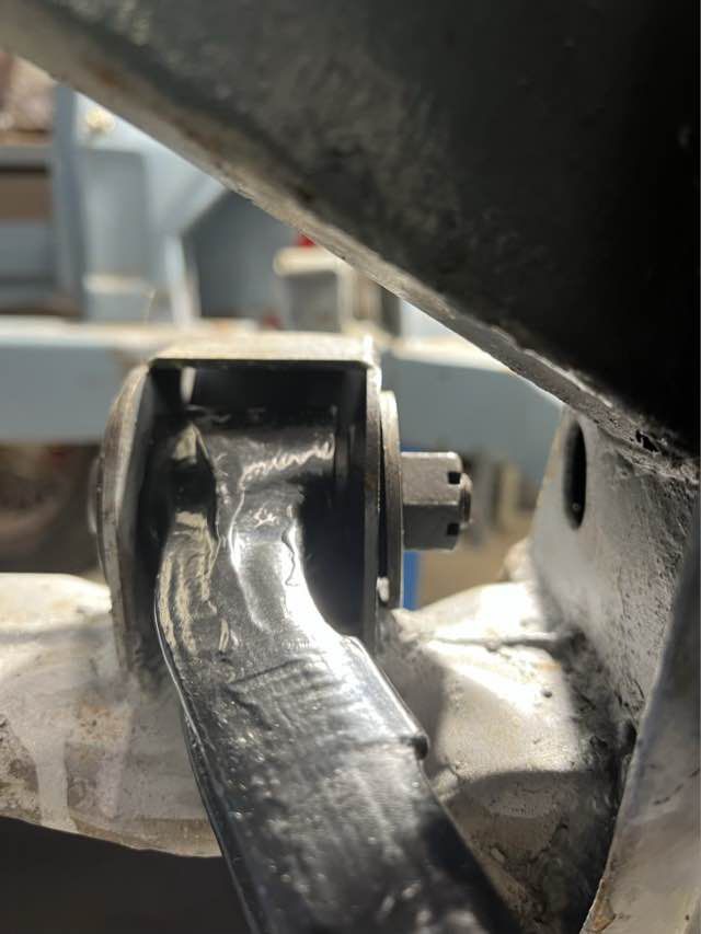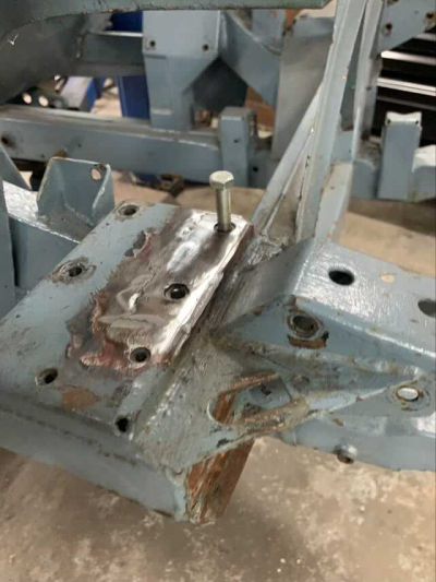 Die vordere, obere Befestigung für den Hebelstoßdämpfer musste repariert werden. Die Hebelstoßdämpfer werden mit vier Schrauben auf einer Grundplatte befestigt. Die Muttern sind unter der Grundplatte verschweißt, hier hatte sich eine Mutter gelöst.