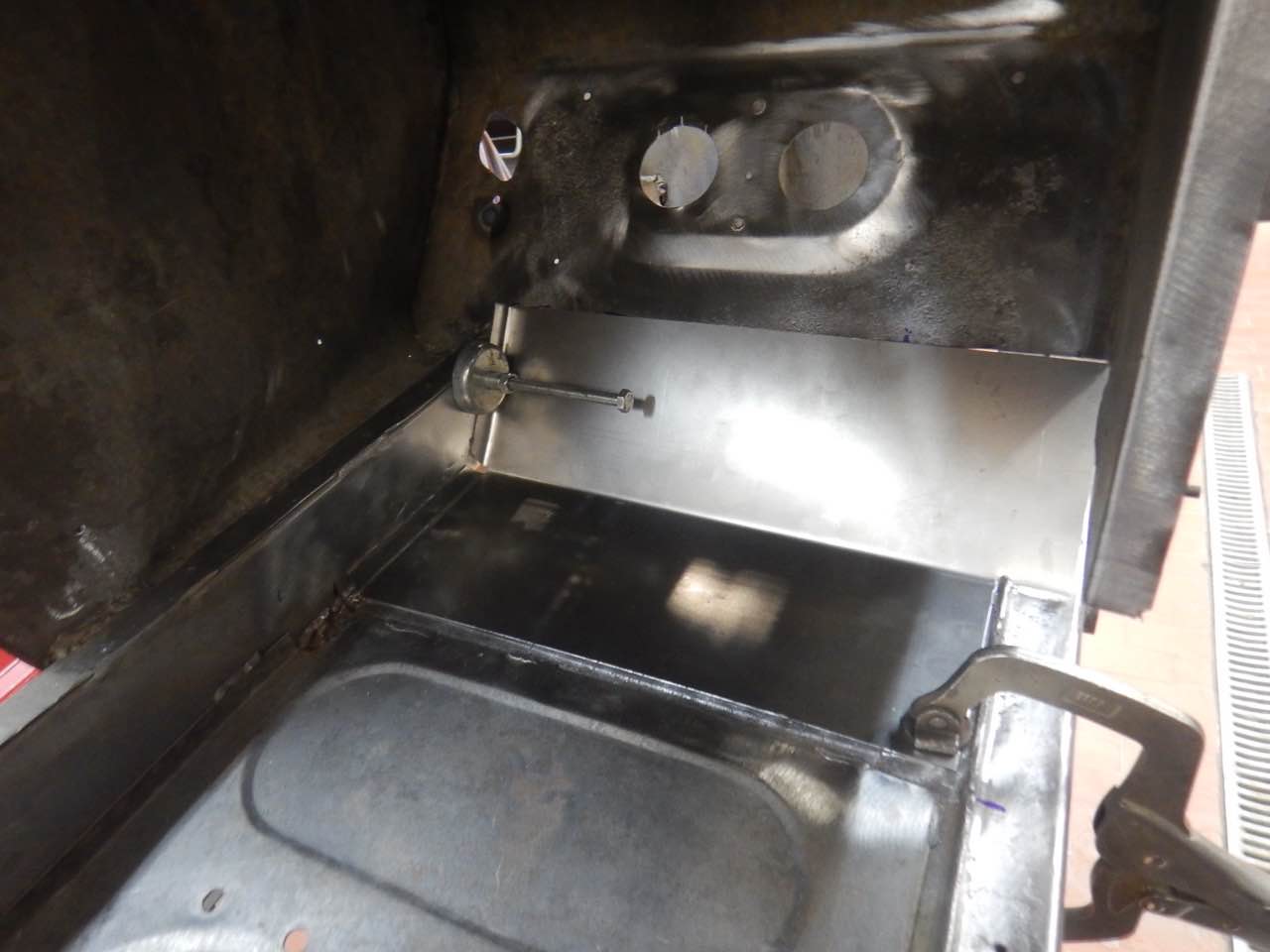 Der Fussraum auf der Fahrerseite musste überarbeitet werden. Eins der Blecher, auf den Abbildungen ist das ganz gut zu erkennen, musste ersetzt werden. Das Blech wurde nit den entsprechenden Sicken angefertigt und eingeschweißt. Es wurden ebenfalls die seitlichen Anschlussbleche überarbeitet.