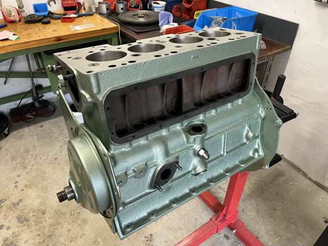 Motor ist überholt und wieder zurück. Es wurden neue Buchsen gesetzt mit neuen M-Kolben. Kurbelwelle ist neu gelagert und gewuchtet. Motor wurde auf Dichtheit geprüft und neu lackiert. In den kommenden Wochen wird der Motor zusammengebaut.