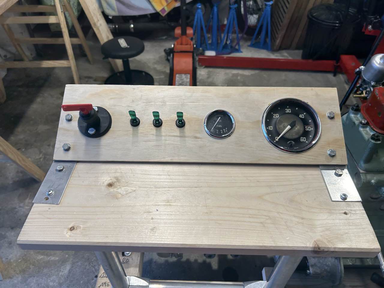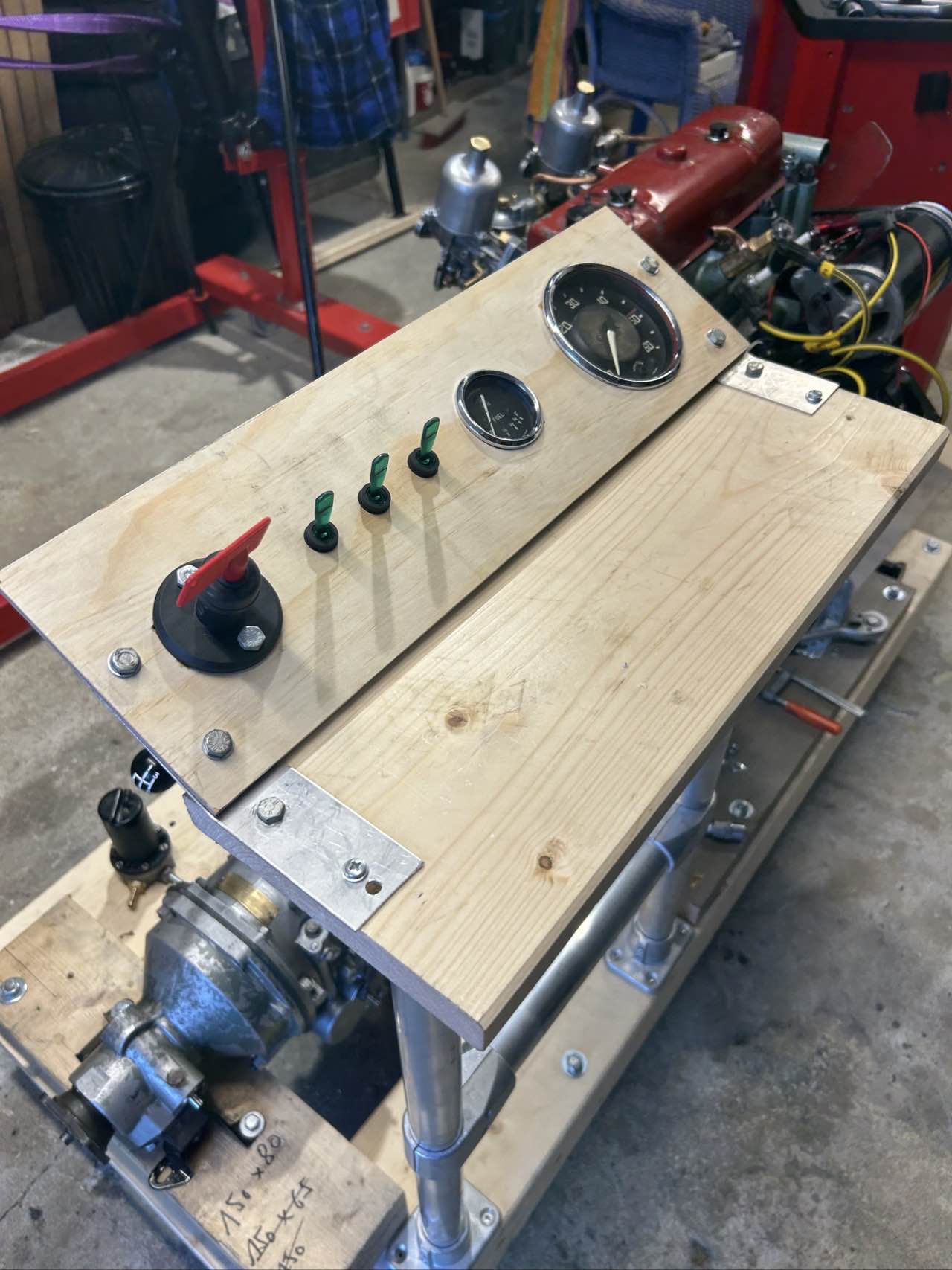 Dazu haben wir ein Basisgestell aufgebaut auf dem dann anschließend die notwendigen Komponenten befestigt wurden. Für die Steuerung wurde ein "Bedienpanel" gebaut, hier wurden der Drehzahlmesser sowie das Öldruck/Wassertemperatur Instrument eingebaut.